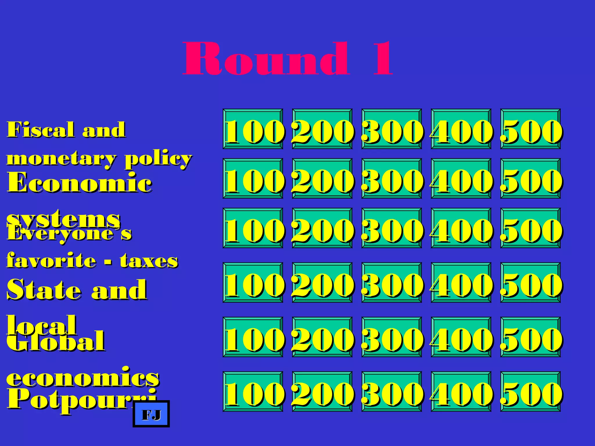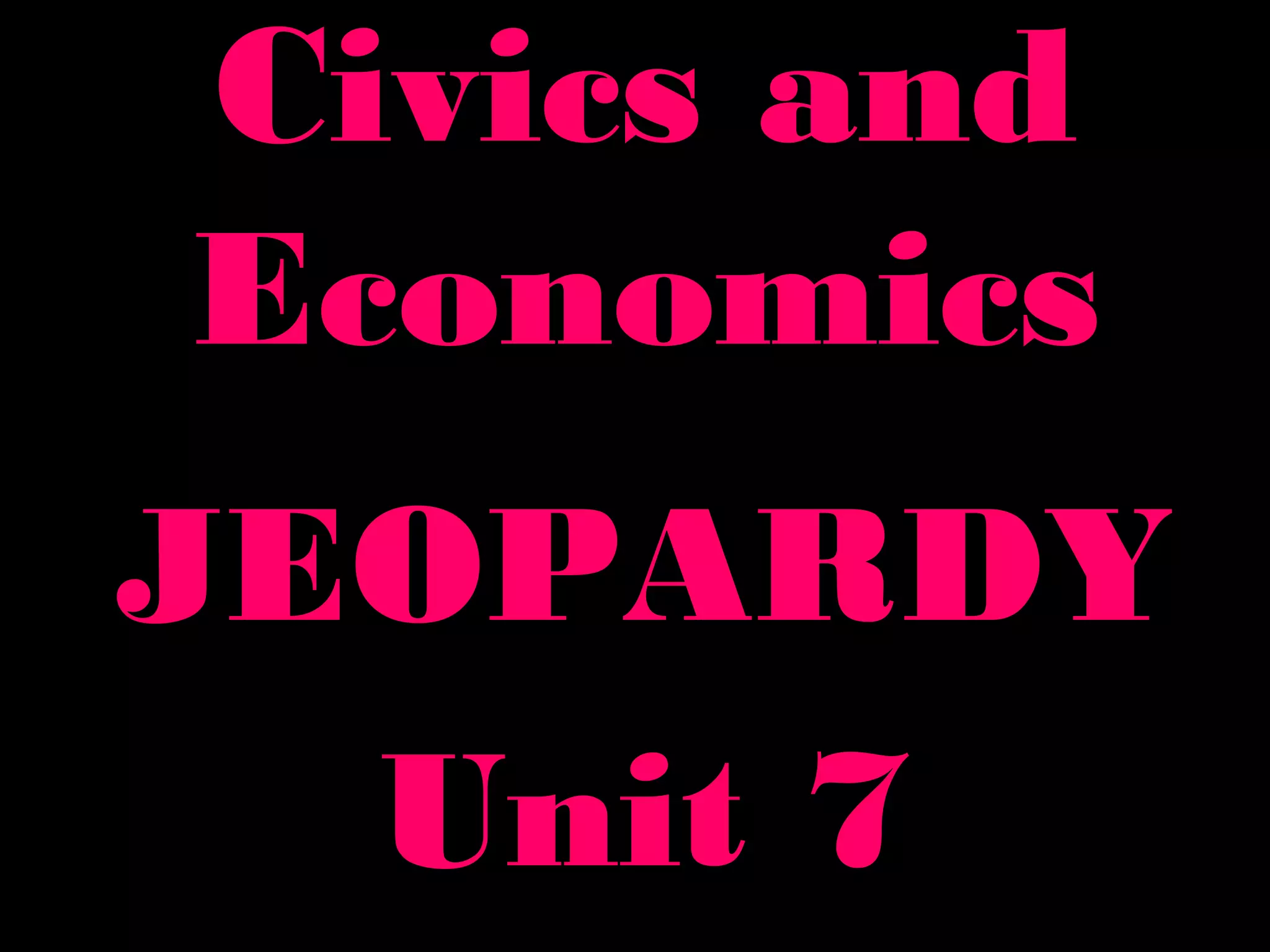This document appears to be a Jeopardy-style game covering topics in civics and economics. It includes categories and clues related to fiscal and monetary policy, economic systems, taxes, global economics, state and local government, and various other topics. The clues are presented in the form of questions covering definitions and key terms in economics and government.