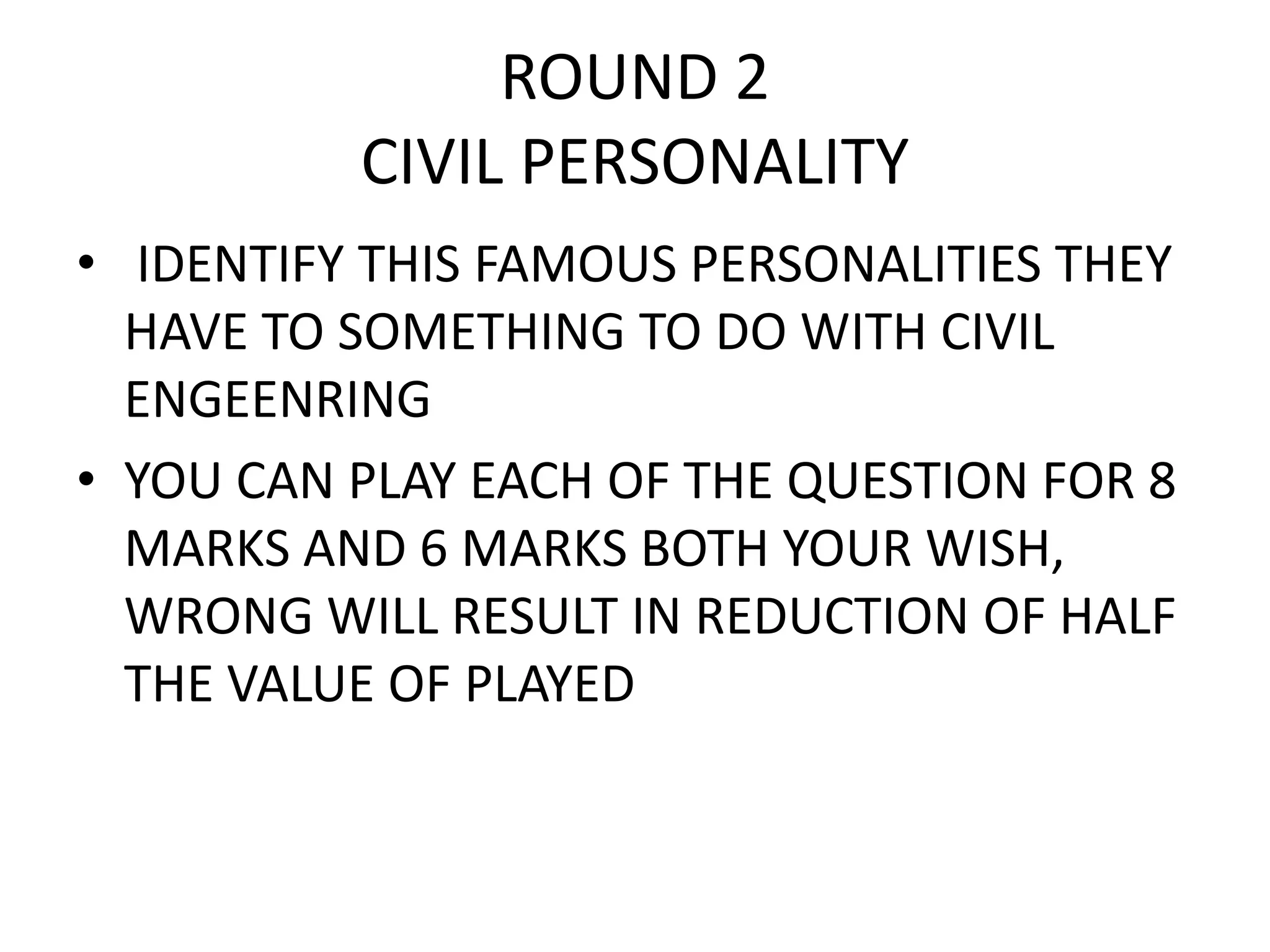 This document contains 7 questions about famous civil engineers and personalities related to civil engineering. Some of the people identified are: