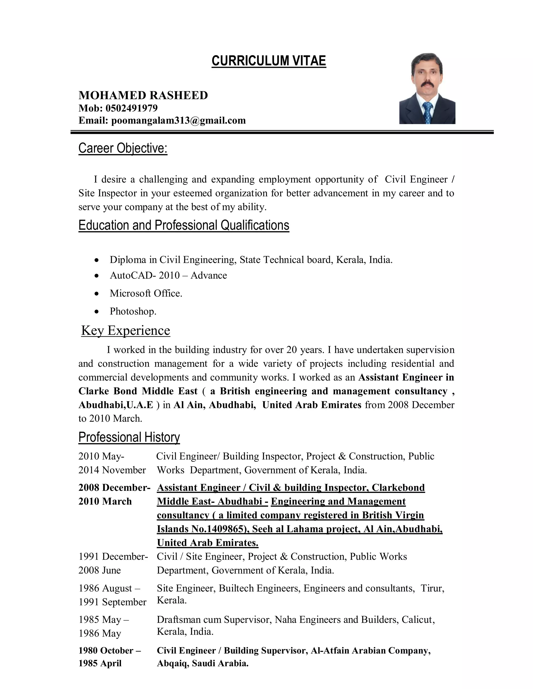 The document is a curriculum vitae for Mohamed Rasheed, who has over 20 years of experience in the building industry as a civil engineer and site inspector. He has a diploma in civil engineering and experience using AutoCAD, Microsoft Office, and Photoshop. His professional history includes roles as an assistant engineer in Abu Dhabi from 2008-2010 and as a civil engineer/building inspector for the government of Kerala, India from 2010-2014. He has supervised numerous residential and commercial projects both in India and the Middle East.