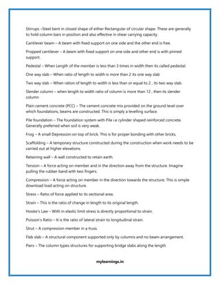 The document provides an overview of essential civil engineering basics, including key structural components such as sub-structures, super-structures, and various types of foundations. It explains concepts related to concrete, cement, aggregates, and construction terms, such as stress, strain, and different slab types. Additionally, it addresses the properties of materials and the factors affecting concrete setting times.