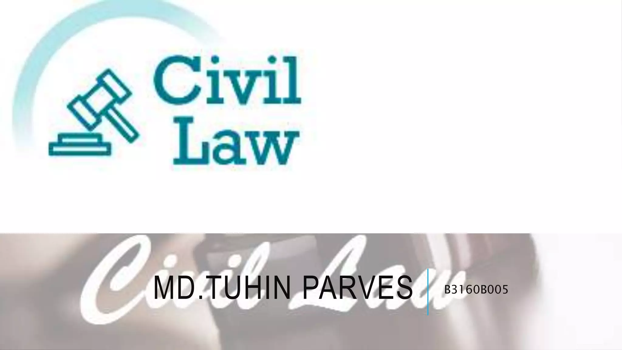 Civil law is the body of laws that govern private and non-criminal legal matters. It is a codified system based on Roman law with detailed codes organizing the laws. More than 80 countries operate under a civil law system including Germany, France, Japan, and Russia. Judges in a civil law system have less flexibility than common law as they must rely on and apply the existing legal codes rather than interpret laws or precedents.