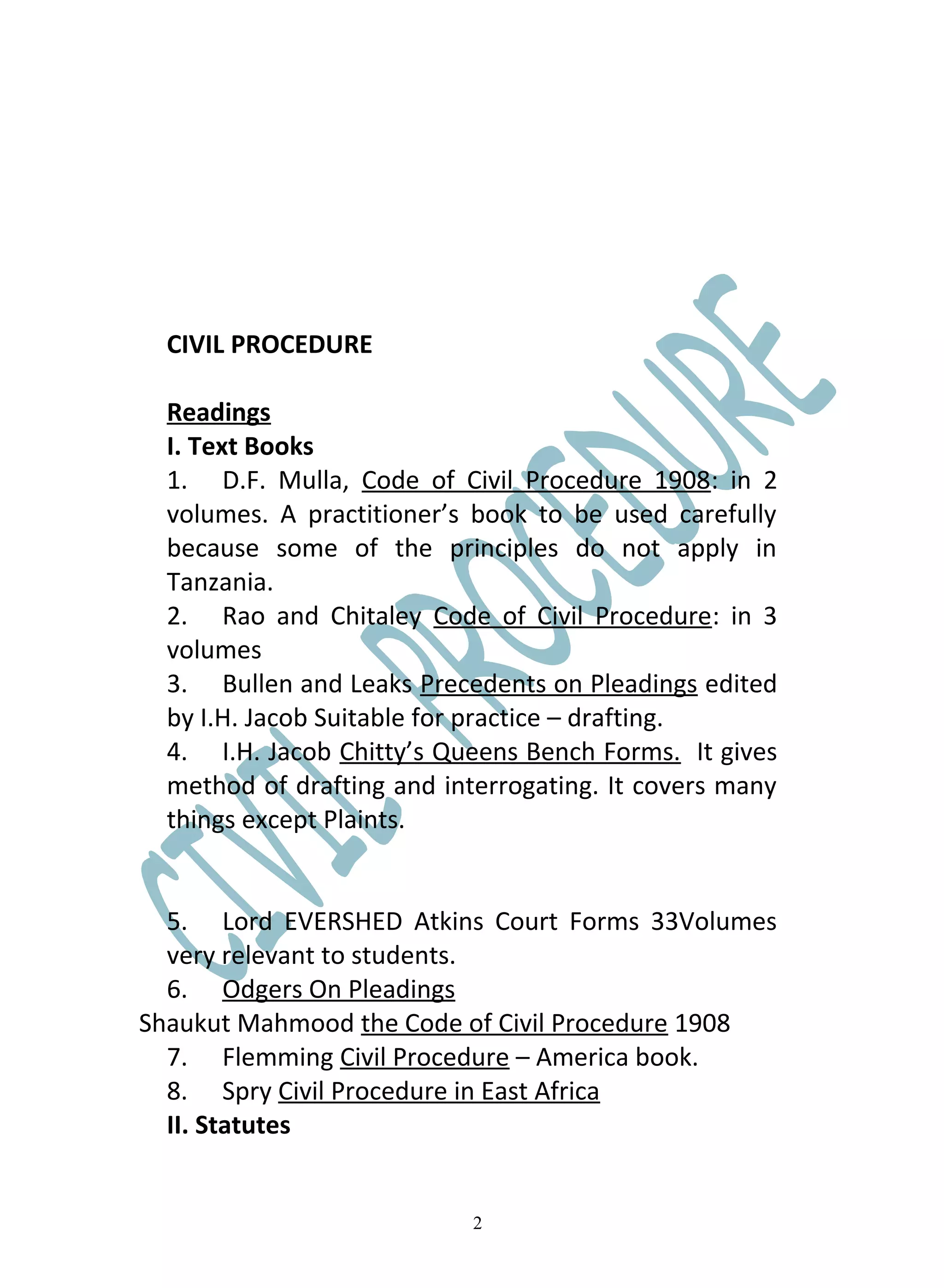 This document provides an overview of civil procedure in Tanzania. It begins by listing recommended textbooks on the topic. It then discusses the functions of civil procedure, noting that it helps resolve arguments and ensures rights can be obtained through procedural rules.