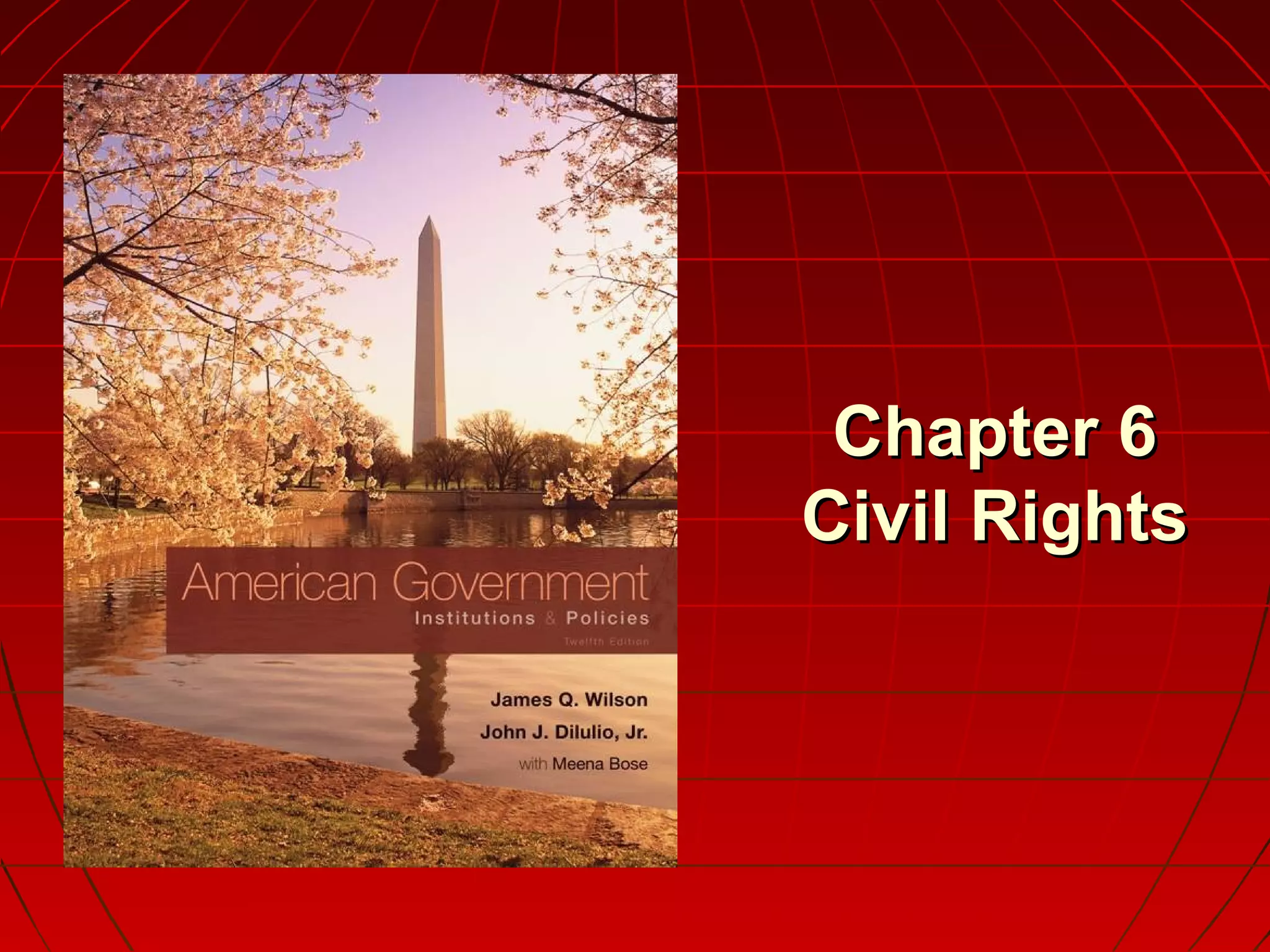 This document discusses the history of civil rights in the United States, including key court cases and legislation. It covers racial segregation in schools and public facilities, the civil rights movement of the 1950s-60s, the Civil Rights Act of 1964, and subsequent legislation regarding equal rights for women and affirmative action. It also examines legal issues around same-sex relationships and gay marriage. Key events summarized include Brown v. Board of Education ending school segregation, the Civil Rights Act of 1964 signed by President Johnson, and the Lawrence v. Texas Supreme Court case impacting laws targeting homosexuality.
