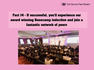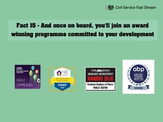 The document summarizes several Civil Service Fast Stream schemes. It describes 2-4 year leadership development programs that offer 1,500 roles annually and blend structured and on-the-job learning to prepare candidates for senior leadership. Salaries range from £25,000-£55,000 depending on the scheme and level of experience, with opportunities for secondments and rotations across government departments. The Fast Stream offers candidates exposure to policy, operational, diplomatic, and analytical roles.