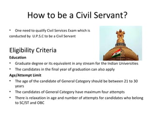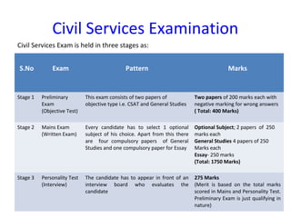 The civil services examination consists of three stages: a preliminary objective test (400 marks), a mains written exam with compulsory and optional subjects (1750 marks), and a personality test (275 marks). Candidates must have a graduate degree and be between 21 to 30 years old, with specific age and attempt relaxations for SC/ST and OBC candidates. The preliminary exam is qualifying, while merit is determined based on mains and personality test scores.