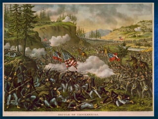 The Civil War began in 1861 with the Confederate attack on Fort Sumter and lasted until 1865, involving many major battles such as Antietam, Gettysburg, and in Georgia, Chickamauga and Sherman's March to the Sea which helped turn the tide in favor of the Union. Key events included the Union blockade of Southern ports, the Emancipation Proclamation freeing slaves, and Lee's defeat at Gettysburg which marked a turning point.
