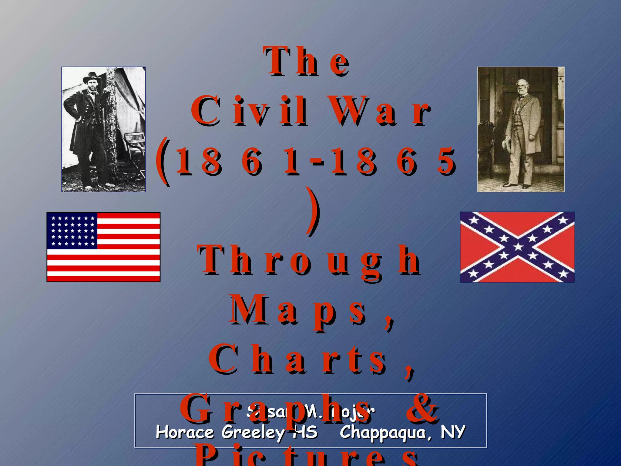 The document is a presentation about the American Civil War from 1861-1865. It contains over 50 slides with titles covering various topics about the war including comparisons of the North and South, maps of railroad lines and population in 1860, leaders and generals of the Union and Confederacy, key battles such as Bull Run, Antietam, Gettysburg, and Vicksburg, the Emancipation Proclamation and African American recruitment, events in 1863 like the New York City draft riots, Sherman's March to the Sea in 1864, Lincoln's reelection that year, and the war's conclusion with Lee's surrender at Appomattox Courthouse and Lincoln's assassination at Ford's Theater.