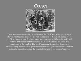The American Civil War was fought between 1861 and 1865 and had many causes, including slavery and sectional differences between the North and South. The North opposed the expansion of slavery while the South depended on slavery. Major battles included Fort Sumter in 1861, Antietam in 1862, Gettysburg in 1863, and Vicksburg in 1863, which marked a major turning point. The war included naval battles between ironclad ships and ended with the South's surrender in 1865 after major Union general Ulysses S. Grant employed a strategy of constant pressure on Confederate forces.