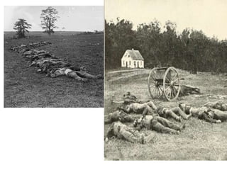 The document summarizes several major battles and events of the American Civil War from 1861 to 1864, including Fort Sumter, First Bull Run, the Monitor and Merrimac naval battle, Shiloh, Antietam, Fredericksburg, the Conscription Act of 1863, Vicksburg, Gettysburg, the Battle of Atlanta, and Sherman's March to the Sea. General Grant emerged as a prominent Union commander after victories at Vicksburg and Chattanooga.