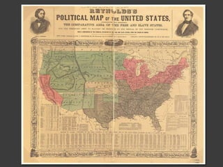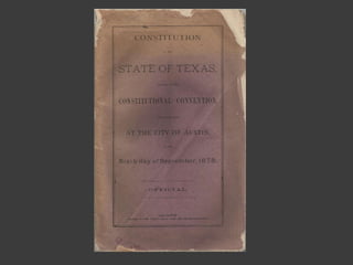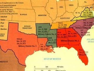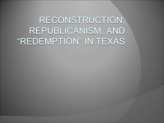 The document provides background on Texas during the Civil War and Reconstruction era from 1861 to 1876. It discusses key events like the Dred Scott decision, secession, major battles in Texas, the surrender at Appomattox, myths of Reconstruction, and the various phases of Reconstruction in Texas from the Provisional Government to Redemption. Freedmen faced Black Codes and racial discrimination as the social status of freed slaves was a divisive issue during this turbulent period of American history.