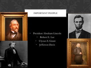 The Civil War began in 1861 and ended in 1865. It was fought between the northern and southern states over the issues of states' rights and slavery. Key figures included Abraham Lincoln, Robert E. Lee, Ulysses S. Grant, and Jefferson Davis. Major events were South Carolina's secession from the Union in January 1861, the First Battle of Bull Run in July 1861, the Emancipation Proclamation in January 1863, Lee's surrender to Grant in April 1865, and Lincoln's assassination later that month. The war ultimately ended slavery and preserved the United States as one country.