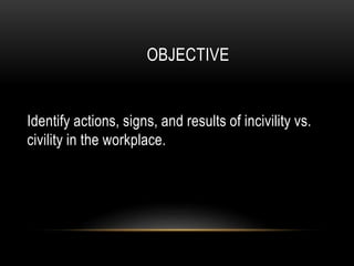 The document discusses civility and incivility in the workplace. It defines civility as polite, courteous conduct while incivility refers to rude behavior. The document outlines signs and actions of incivility that can infect the workplace such as disrespectful behavior. It also presents principles for creating a civil workplace like showing respect, restraint and refinement. Statistics show increasing online searches for civility and poll results on civility in America from 2011. The objective is to identify and compare actions, signs and results of incivility versus civility.