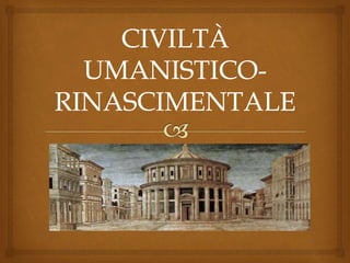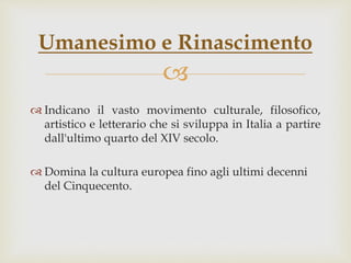 Il documento presenta il movimento culturale, filosofico, artistico e letterario che si sviluppò in Italia tra il XIV e il XVI secolo, noto come umanesimo e rinascimento. L'umanesimo si concentra sulla riscoperta dei classici greci e latini, mentre il rinascimento enfatizza la rivalutazione della civiltà classica, un crescente ottimismo verso la vita e un rinnovato interesse per la natura e il ruolo dell'intellettuale. Entrambi i periodi rappresentano una fase creativa significativa nella storia europea.