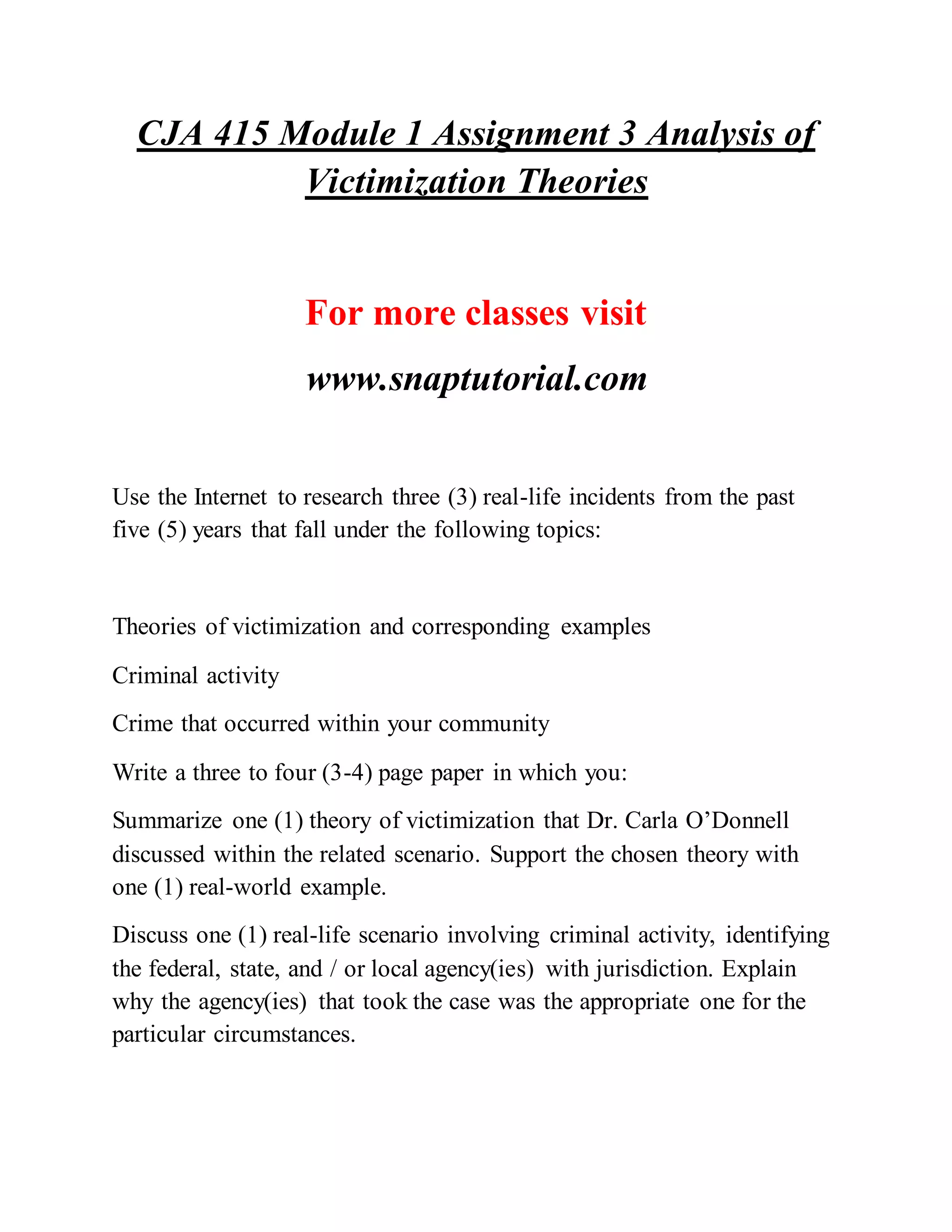 The document outlines a series of assignments for a criminal justice course focused on victimization theories and practical applications within law enforcement. It includes research on real-life criminal incidents, evaluations of notable cases, and the development of crime prevention strategies and training curricula aimed at improving victim treatment. Throughout, it emphasizes the importance of integrating victimology and criminology theories into law enforcement practices to better protect and serve communities.