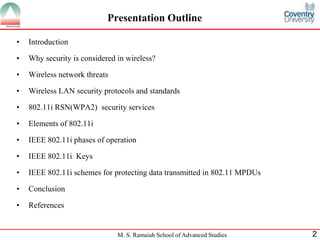 The document presents a detailed overview of wireless networking security, outlining various security threats and the importance of implementing effective wireless security policies. It discusses protocols such as WPA2 (802.11i), focusing on authentication, access control, and data protection mechanisms against attacks like man-in-the-middle and denial of service. The conclusion emphasizes the necessity of routinely updating passwords and configuring network settings to enhance security.