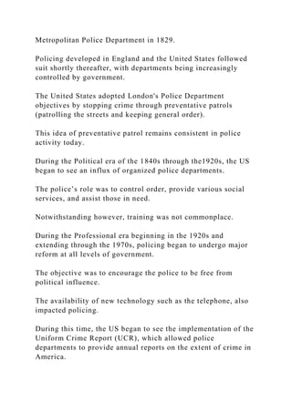 The document discusses the evolution and challenges of law enforcement, tracing the history of policing from early vigilantism and slave patrols to modern-day community policing and the various structures of police organizations. It highlights the importance of discretion in policing, the issues of police misconduct, and the impact of racial profiling on community relations. Additionally, the document emphasizes the necessity for integrity and community service in law enforcement, incorporating scriptural references to underscore these values.