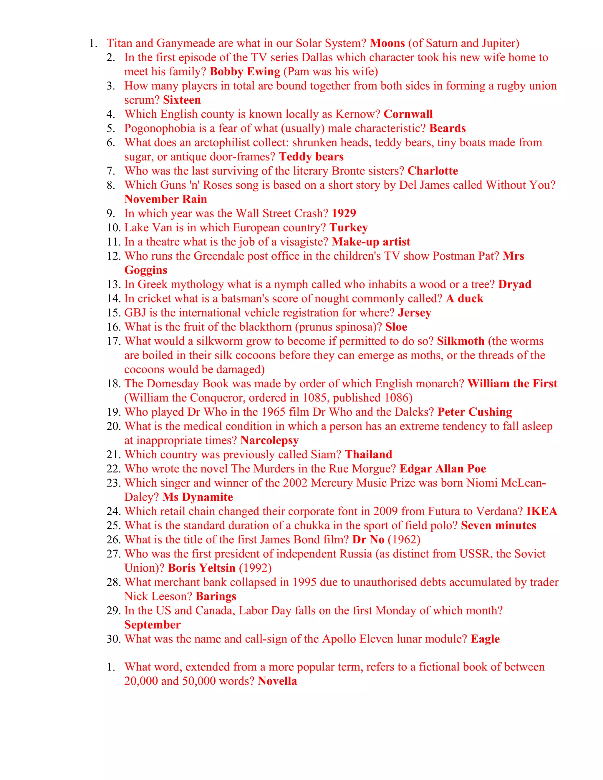 This document contains trivia questions from various topics including astronomy, geography, history, literature, and more. It asks about the moons of various planets, characters from TV shows and books, inventions that changed publishing, and terms used for different literary forms and devices. The questions cover numerous famous authors and their works from centuries ago to recent decades.