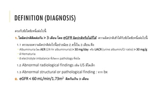 3 เดือน โดย eGFR ผิดปกติหรือไม่ก็ได้ ความผิดปกติเข้าได้กับข้อใดข้อหนึ่งต่อไปนี้ 1.1 ตรวจเจอความผิดปกติต่อไปนี้ อย่างน้อย 2 ครั้งใน 3 เดือน คือ Albuminuria โดย AER (24-hr albuminuria) > 30 mg/day หรือ UACR (urine albumin/Cr ratio) > 30 mg/g มี Hematuria มี electrolyte imbalance ที่เกิดจาก pathology ที่ท่อไต 1.2 Abnormal radiological findings เช่น US มีไตเล็ก 1.3 Abnormal structural or pathological finding : จาก bx eGFR < 60 mL/min/1.73m2 ติดกันเกิน 3 เดือน