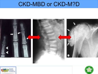 This document discusses chronic kidney disease-mineral and bone disorder (CKD-MBD). It begins with an overview of the key components involved in CKD-MBD, including calcium, phosphorus, parathyroid hormone, vitamin D, fibroblast growth factor 23, and magnesium. The document then presents two clinical cases involving patients with CKD and discusses treatment options based on their lab results. It also covers the roles of vitamin D and magnesium in vascular pathology and mortality in CKD patients. Guidelines for the treatment of secondary hyperparathyroidism from KDIGO are also summarized.