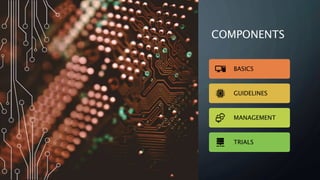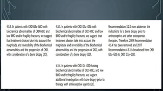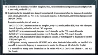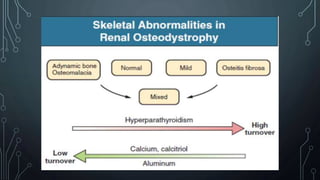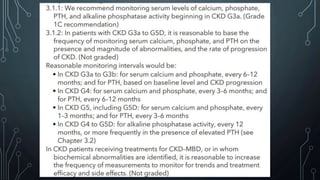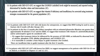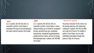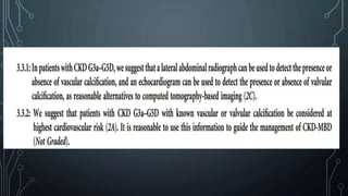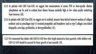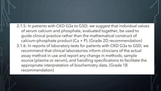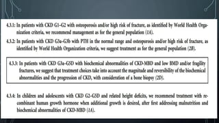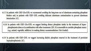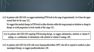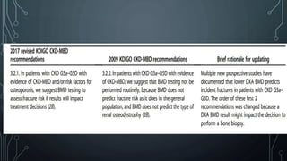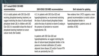 The document summarizes guidelines from KDIGO on chronic kidney disease-mineral and bone disorder (CKD-MBD). It discusses the components and basics of CKD-MBD, including the key players involved like phosphorus, calcium, FGF23, and vitamin D. It also summarizes sections from the guidelines on diagnosis of CKD-MBD through biochemical abnormalities, bone abnormalities, and vascular calcification. Management guidelines are summarized for targeting high serum phosphate and PTH levels. Several trials evaluating therapies for CKD-MBD like vitamin D analogues, phosphate binders, and calcimimetics are also briefly summarized.