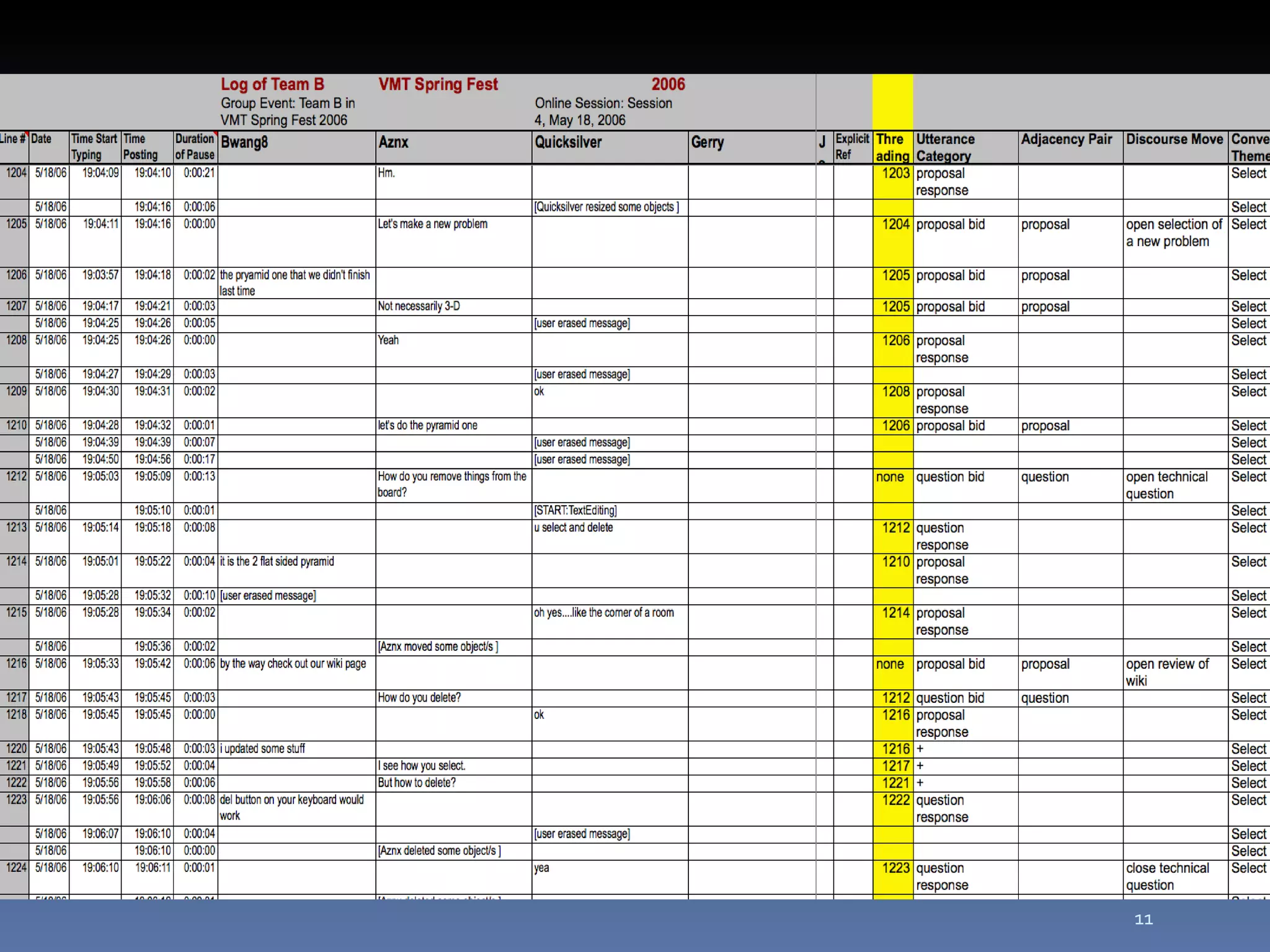The document discusses computer-supported collaborative learning (CSCL) and virtual math teams (VMT) as contexts for studying group cognition and communication. It examines how small groups solve problems and build knowledge together online. The author analyzes VMT group interactions to understand how cognition occurs at the group level through communication sequences. The analysis focuses on how groups coordinate tasks, construct meaning jointly, and produce shared artifacts and understanding.