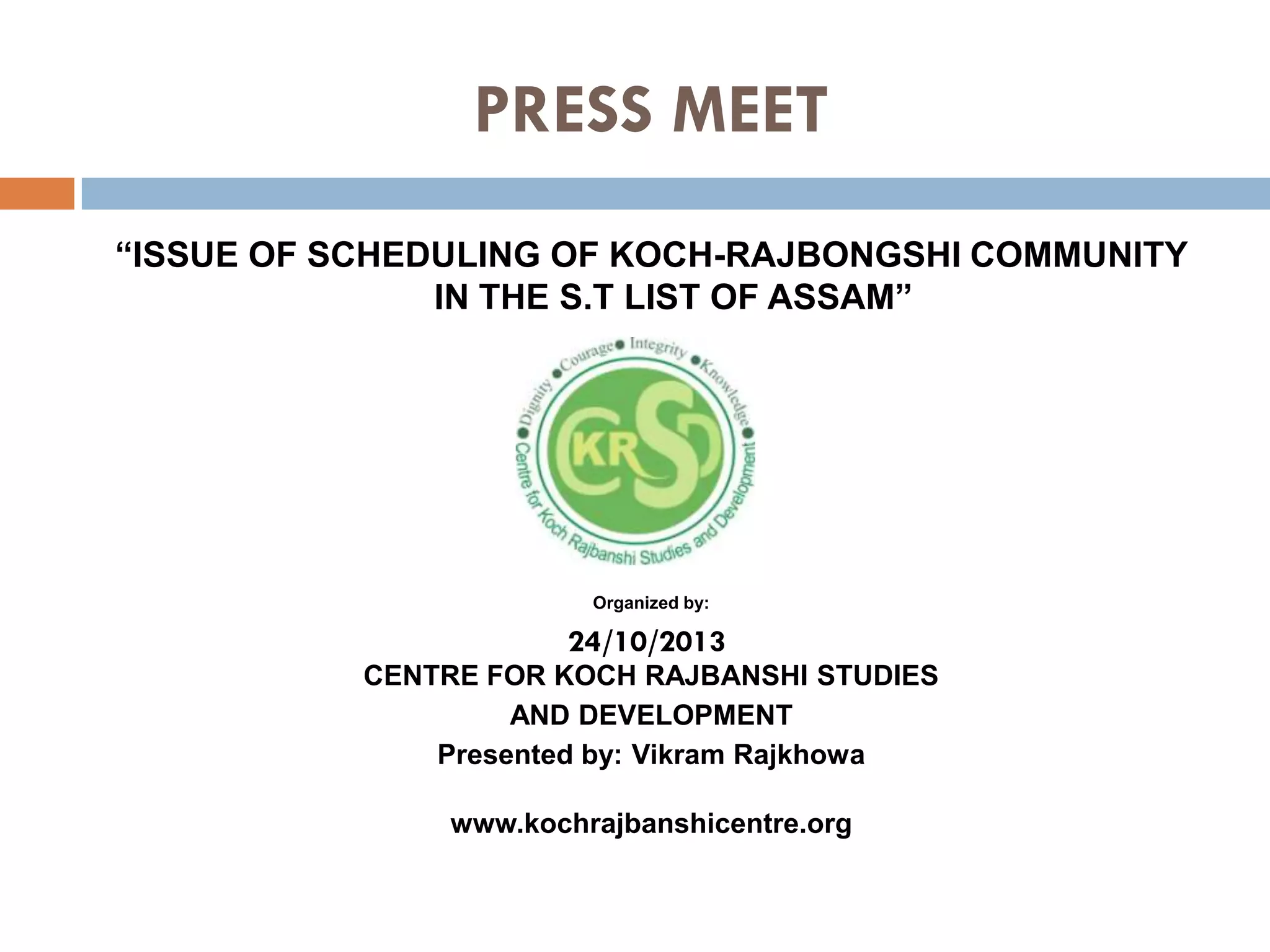 This document summarizes the presentation made by Vikram Rajkhowa on the issue of scheduling the Koch-Rajbongshi community in the Scheduled Tribes list of Assam. It discusses the main grounds for granting ST status based on reports and recommendations, including the Tribal Research Institute report finding the community meets tribal criteria. It also discusses politics of sabotage aimed at dividing the community and delaying the process. The organization presents its position that the community should be immediately granted ST status as Plains tribes based on evidence, and legal action has been initiated on the matter.