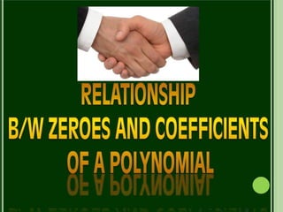 This document discusses polynomials. It defines a polynomial as an expression constructed from variables and constants using addition, subtraction, multiplication, and exponents. Polynomials appear in many areas of mathematics and science. The document then discusses the terms, coefficients, and different types of polynomials including linear, quadratic, cubic, and constant polynomials. It also discusses the degree and maximum number of zeroes of each type of polynomial. Finally, it discusses using the division algorithm to find quotients, remainders, and factors of polynomials.