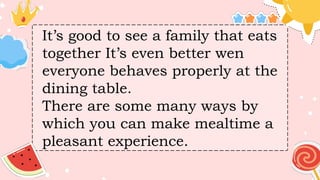 see a family that eats together It’s even better wen everyone behaves properly at the dining table. There are some many ways by which you can make mealtime a pleasant experience.