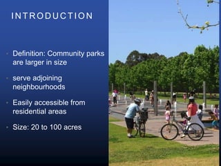 The document summarizes two case studies of community parks - the Malaysia-China Friendship Park in Kuching, Malaysia and the Tualatin Community Park in Oregon, USA. The Malaysia-China Friendship Park was built in 2005 to commemorate 30 years of diplomatic relations between the two countries. It is 2.8 hectares and contains both Chinese and local Malaysian architecture. The Tualatin Community Park originated from a grove of trees that was later expanded to 27.11 acres. It has facilities like sports fields, a skate park, and picnic shelters. Both parks provide spaces for activities like jogging, exercising, celebrations and allow interaction with natural landscapes.