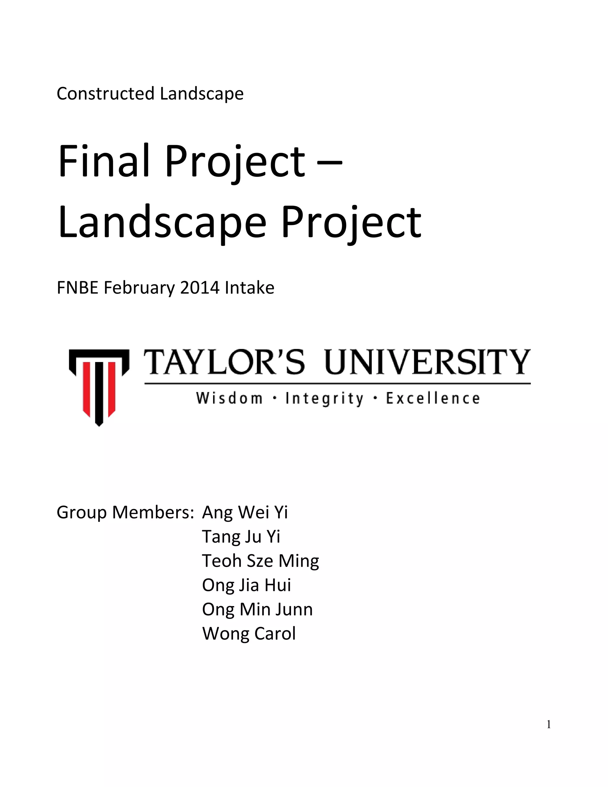 This document provides details on the constructed landscape final project for Taylor's University Lakeside Campus. It includes an introduction to the 10m x 10m site, a site analysis, concept, master plan, planting plan, costing details, construction details, and maintenance plan. The project aims to transform an unused area into a green waiting space with benches, plants, a glass roof, and water features to address issues like traffic congestion and air quality.