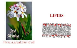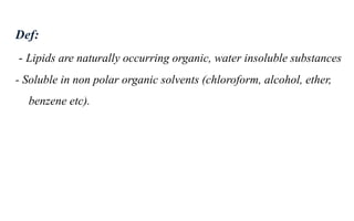 This document provides information about lipids including their definition, classification, and functions. It begins by defining lipids as naturally occurring organic and water-insoluble substances that are soluble in non-polar solvents. It then classifies lipids into simple lipids like triglycerides and waxes, and compound lipids like phospholipids, glycolipids, and lipoproteins. The document discusses the biological importance of lipids, listing functions like serving as an energy source, forming membranes, and absorbing fat-soluble vitamins. It also summarizes several tests used to characterize fats and oils, including iodine number, saponification number, and acid number.