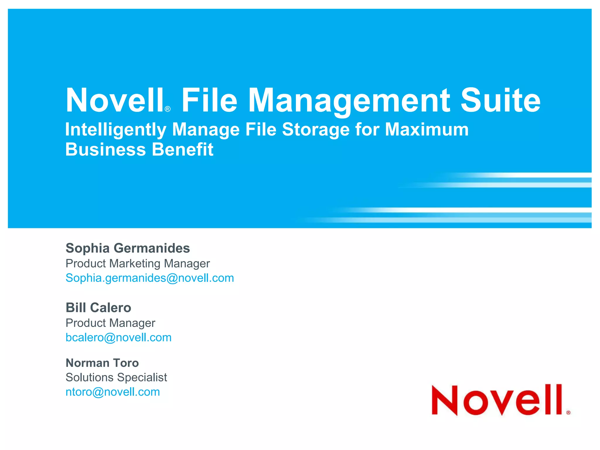 The document summarizes Novell's File Management Suite, which intelligently manages file storage for business benefit. It addresses challenges of explosive unstructured data growth and rising storage costs. The suite enhances existing solutions through identity-driven policy automation to optimize storage, reduce costs, and ensure compliance. Case studies show customers saving hundreds of thousands in storage costs through automated data movement and management.