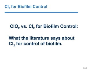 This document discusses the effectiveness of chlorine (Cl2) and chlorine dioxide (ClO2) for controlling biofilms. It summarizes literature findings that Cl2 does not penetrate or remove biofilms well, while ClO2 is more effective at penetrating and removing biofilms. ClO2 is also less affected by pH and forms fewer disinfection byproducts than Cl2. However, ClO2 has some disadvantages in that it must be made on-site using a generator and multiple precursors, which can increase costs compared to Cl2 in some situations.