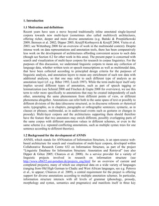This document summarizes ANNIS, a web-based search tool for multi-layer annotated corpora. ANNIS allows multiple independent annotations of the same data in different types and schemes. It was developed for projects analyzing information structure across languages. ANNIS supports diverse search functions, complex annotation relations, and visualization of query matches depending on annotation type. Corpus data is imported into a relational database for performance and can also be exported for other analysis tools.