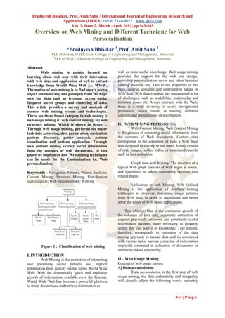 The document discusses web mining techniques for web personalization. It defines web mining as extracting useful information from web data, including web usage mining, web content mining, and web structure mining. Web usage mining involves data gathering, preparation, pattern discovery, analysis, visualization and application. Web content mining extracts information from web document contents. The document then discusses how these web mining techniques can be applied to web personalization by learning about user interactions and interests to customize web page content and presentations.