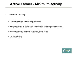 The document provides an overview of CAP reform including criteria for claiming Basic Payment Scheme (BPS) payments, the 'negative list' of non-eligible businesses, and the new measures for young farmers and environmental land management schemes. It outlines the definitions related to crop diversification and ecological focus areas, as well as the necessary compliance requirements and potential penalties. Additionally, it discusses the transition to new online services for managing claims and the support available for farmers in this process.