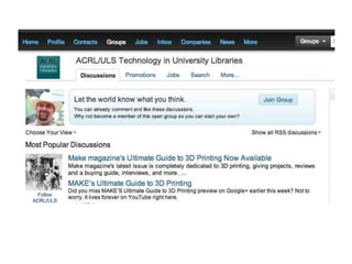 This document discusses makerspaces in academic libraries. It notes some similarities and differences between public and academic libraries regarding makerspaces. While public libraries are a good fit for makerspaces, academic libraries already have some related resources on campus in departments like engineering and art. The document provides examples of makerspaces at different universities and considerations for starting a makerspace, such as identifying user needs, finding space, managing noise and power needs, and identifying potential partners. It emphasizes the importance of planning and highlights how makerspaces can promote learning, creativity, and skills in areas like STEM.