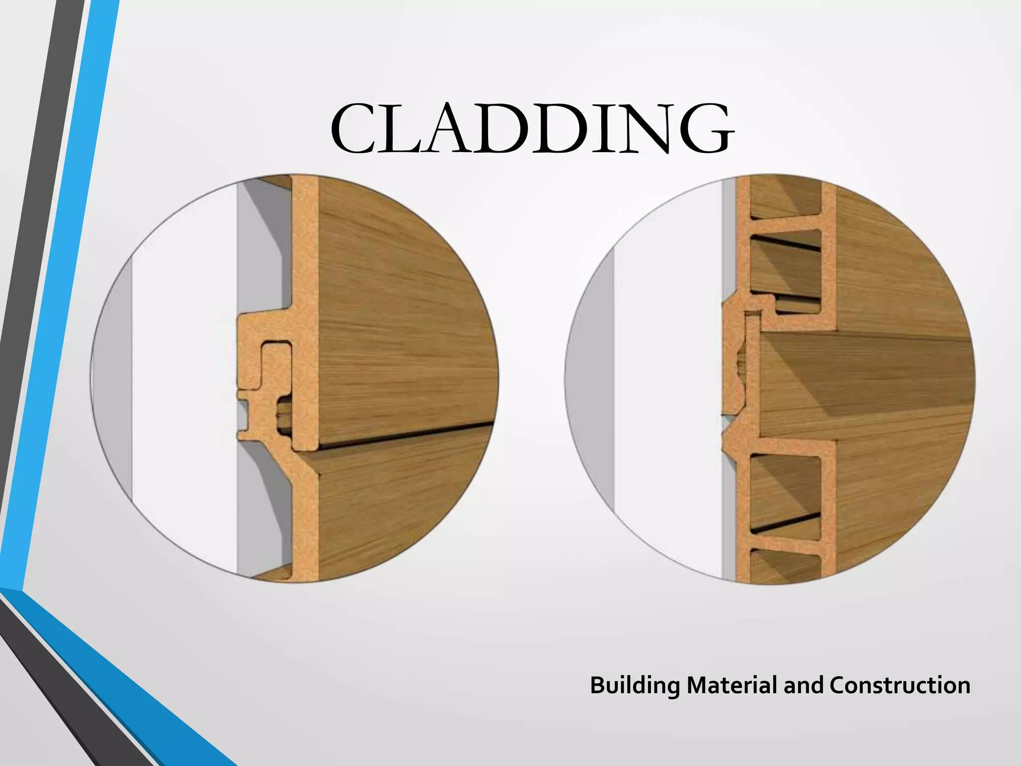 Building cladding refers to the exterior materials used to cover the outside of a building. It serves both a decorative and protective purpose, shielding the building from weather elements while also complementing its architectural style. There are different types of cladding materials like timber, stone, metal, and glass, as well as various installation systems like attached, curtain wall, and infill panels. Cladding provides insulation and protection for the building while allowing for various aesthetic designs.