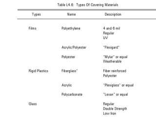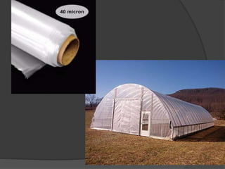 Plastic materials like polyethylene, acrylic/polyester, polyester, and fiberglass reinforced plastics are common cladding materials for greenhouses. Polyethylene is relatively short-lived but transmits 85-88% of sunlight. Acrylic/polyester combines weatherability and heat resistance but is susceptible to wind damage. Polyester has excellent transmittance and heat resistance but limited widths. Fiberglass reinforced plastics are more impact resistant than glass but proper installation is important. Shade nets made of plastic are also used as cladding to protect crops from weather.