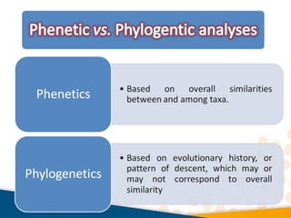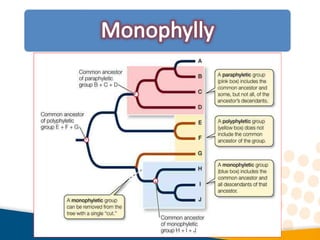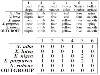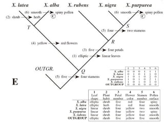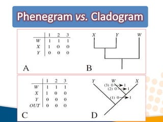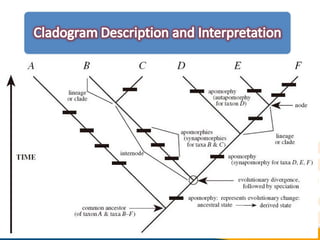 Cladistics, or phylogenetic systematics, is a method for grouping organisms based on shared derived characters. It involves determining primitive (plesiomorphic) and derived (apomorphic) character states and utilizing cladograms as a basis for classification. The document discusses character states among specific taxa and highlights the importance of fewer assumptions in hypotheses.