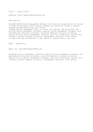 Bridgestonehrs offers denial management software aimed at helping organizations collect denied charges and reduce their frequency by identifying root causes. Their services include various tools such as hospital denial management software, Medicaid insurance discovery, and a patient payment estimator. For updates, users are encouraged to visit their website or contact Wayne Gill via email.