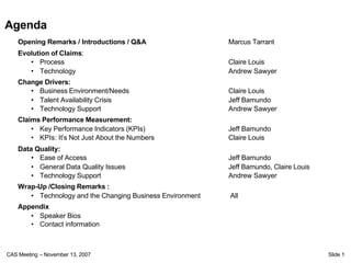The document discusses the evolution of the claims process in the insurance industry, highlighting the transition from manual processes to advanced technology solutions that enhance efficiency and data accessibility. Key drivers of change include shifts in the business environment, talent availability issues, and the need for improved technology to support claims management. The importance of key performance indicators (KPIs) for measuring claims performance and organizational success is emphasized throughout the meeting agenda.