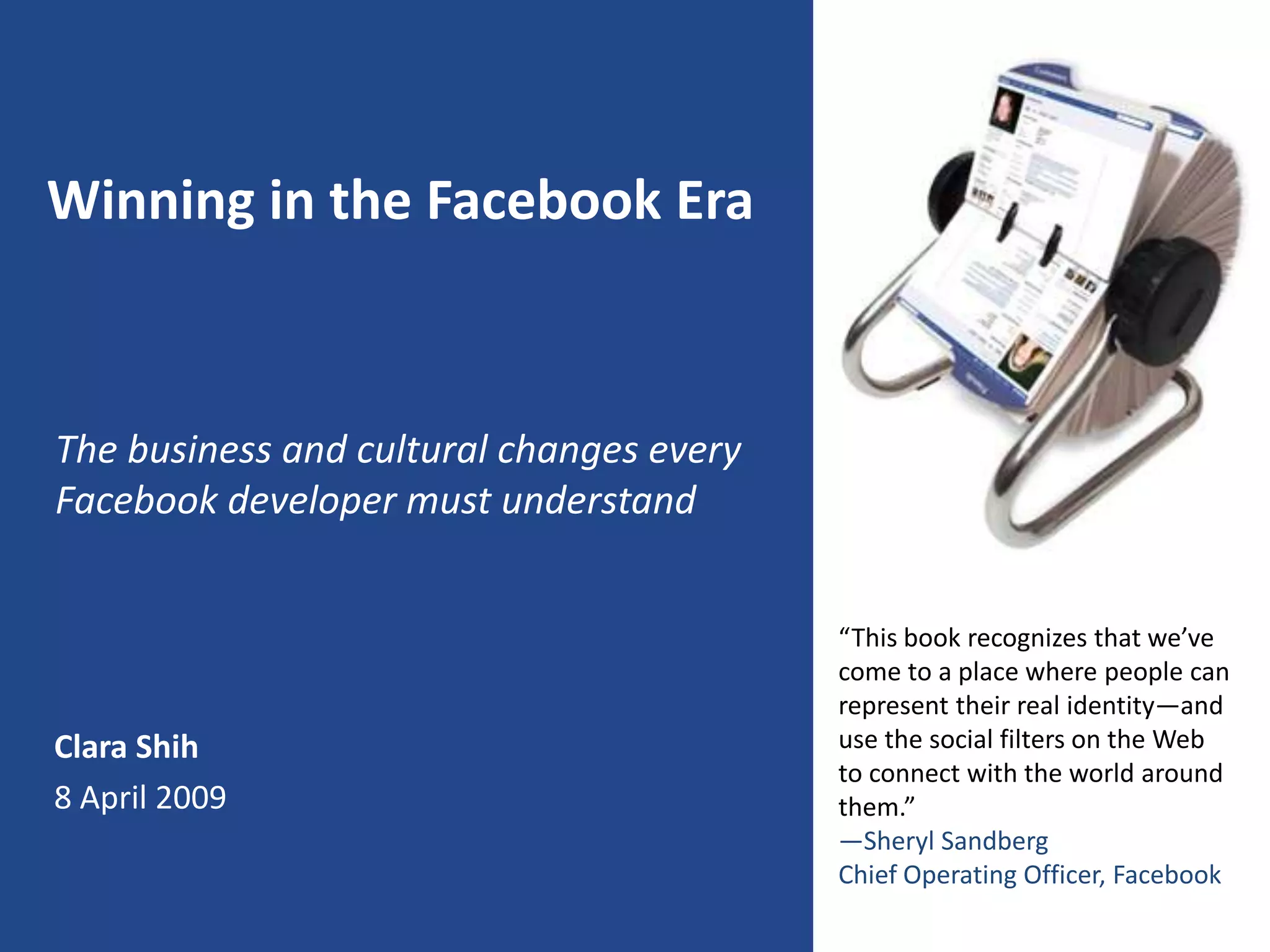 This document discusses how businesses must adapt to succeed in the Facebook era. It summarizes that Facebook has become a trusted online forum for personal identity where users share photos, interests, and connections to friends. As a result, user expectations have changed and businesses are now expected to provide personalized interactions and transitive trust. The document also describes how new modes of communication on Facebook foster weak ties and capture long tail audiences. It provides an example of a recruiting app called Jobs4MyFriends that leverages employee referrals through Facebook.