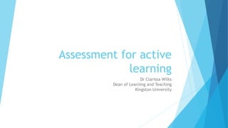 This document discusses principles of effective assessment design for active learning. It emphasizes integrating assessment into the learning process through careful planning of assessment load, timing, and types across a course. Formative assessment and feedback are highlighted as important for building students' skills and confidence. Fairness is ensured through clear communication of grading and assessment criteria to students. The overall goal is for assessment to support learning rather than be done to students.