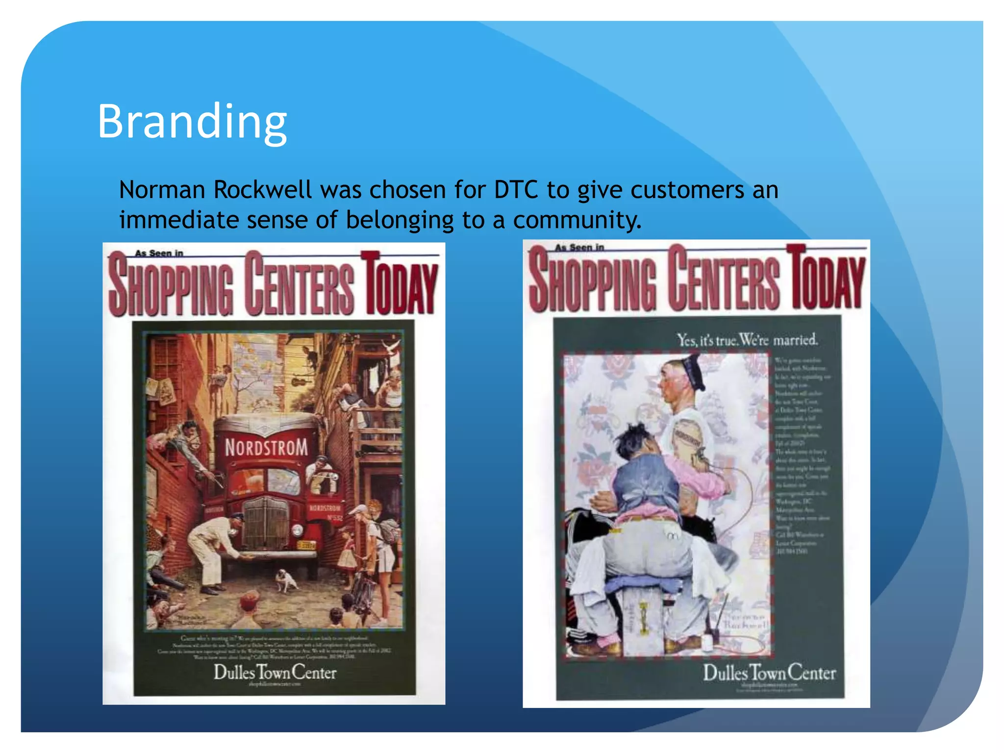 The document discusses branding, loyalty programs, sponsorships, and community involvement for various retail centers. It highlights Norman Rockwell's branding for DTC to create a sense of community. It also outlines sponsorships including a 12-year deal with Cirque du Soleil and contributions to organizations like Imagination Stage, a theatre arts nonprofit founded in 1979. The document appears to be about marketing strategies and community engagement activities for various Lerner retail properties.