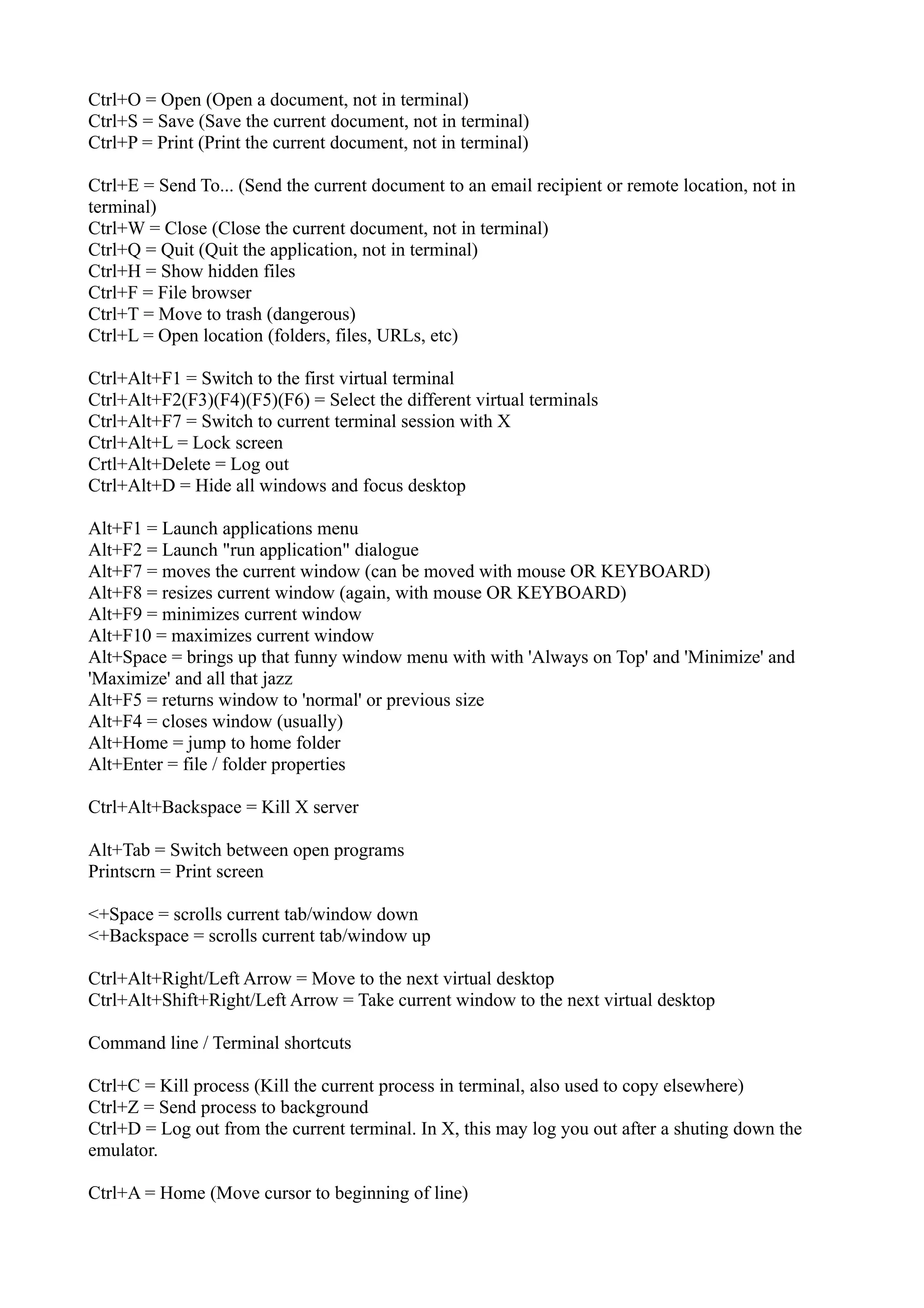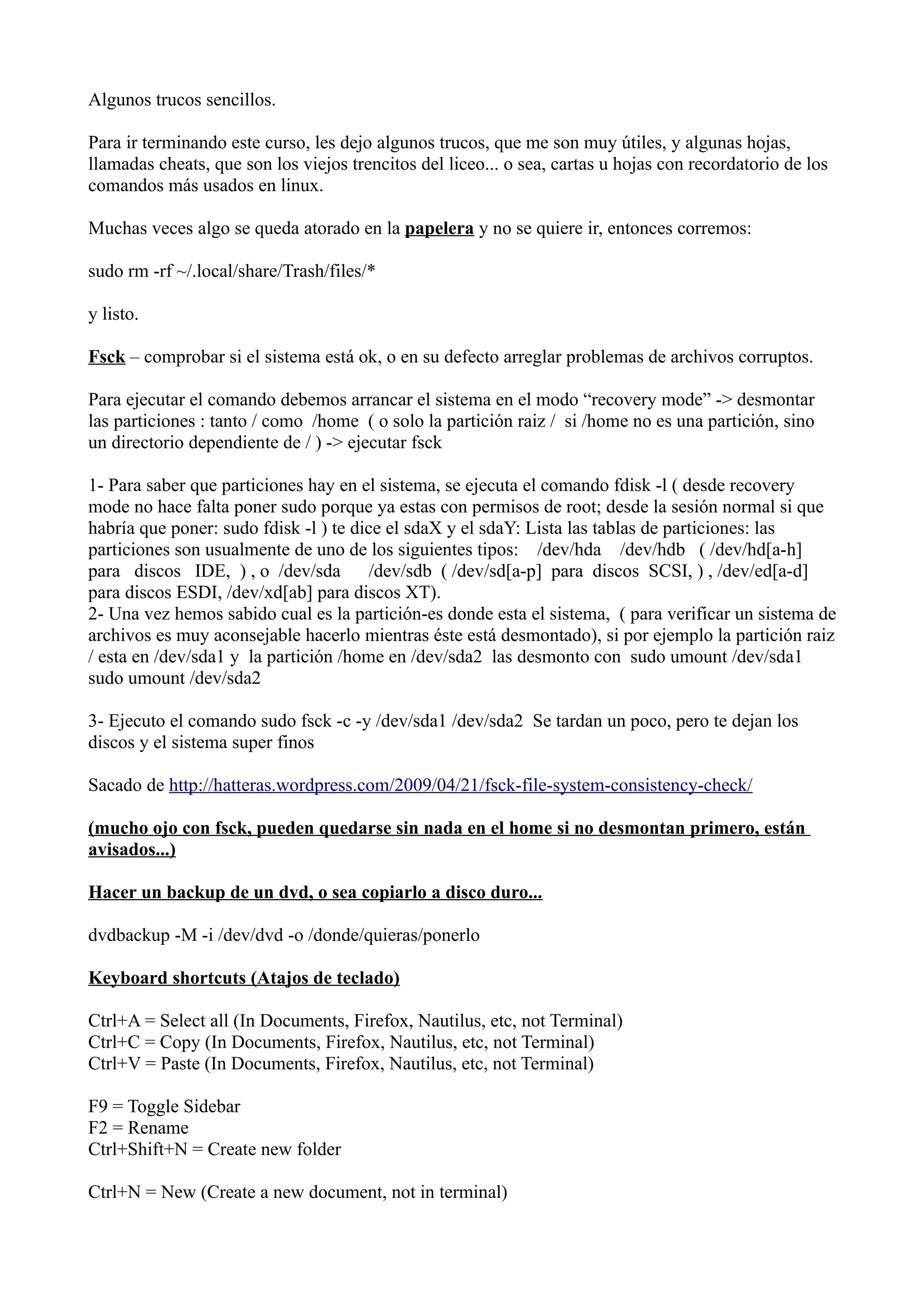 This document provides a collection of tips and shortcuts for using Linux, including commands for system maintenance, file management, backups, updates, networking, and more. Some key tips include using sudo rm -rf ~/.local/share/Trash/files/* to empty a stuck trash, fsck to check the file system, and fdisk -l to view disk partitions. It also lists many keyboard shortcuts for navigating desktop environments and applications.