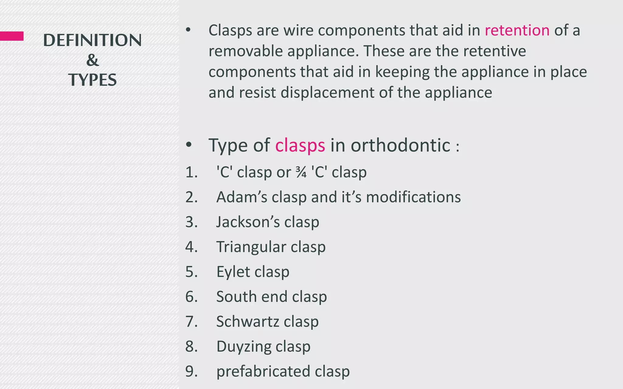 The document discusses various types of clasps used in orthodontic removable appliances for retention, including advantages and disadvantages for each type. It details the construction, applications, and limitations of clasps such as the 'C' clasp, adam's clasp, jackson's clasp, and others. Additionally, it addresses the specific uses and considerations for each clasp type in relation to tooth eruption and patient comfort.
