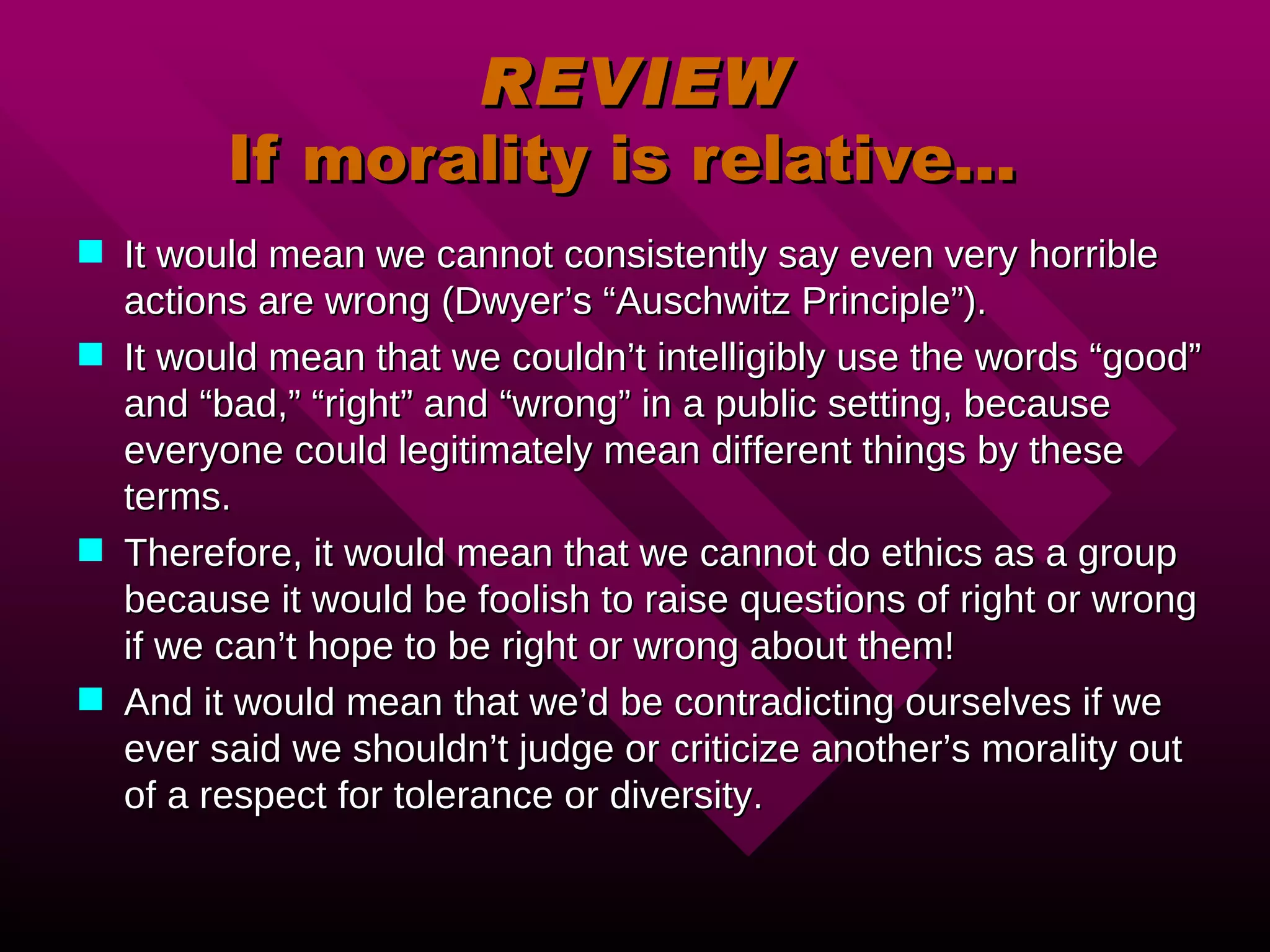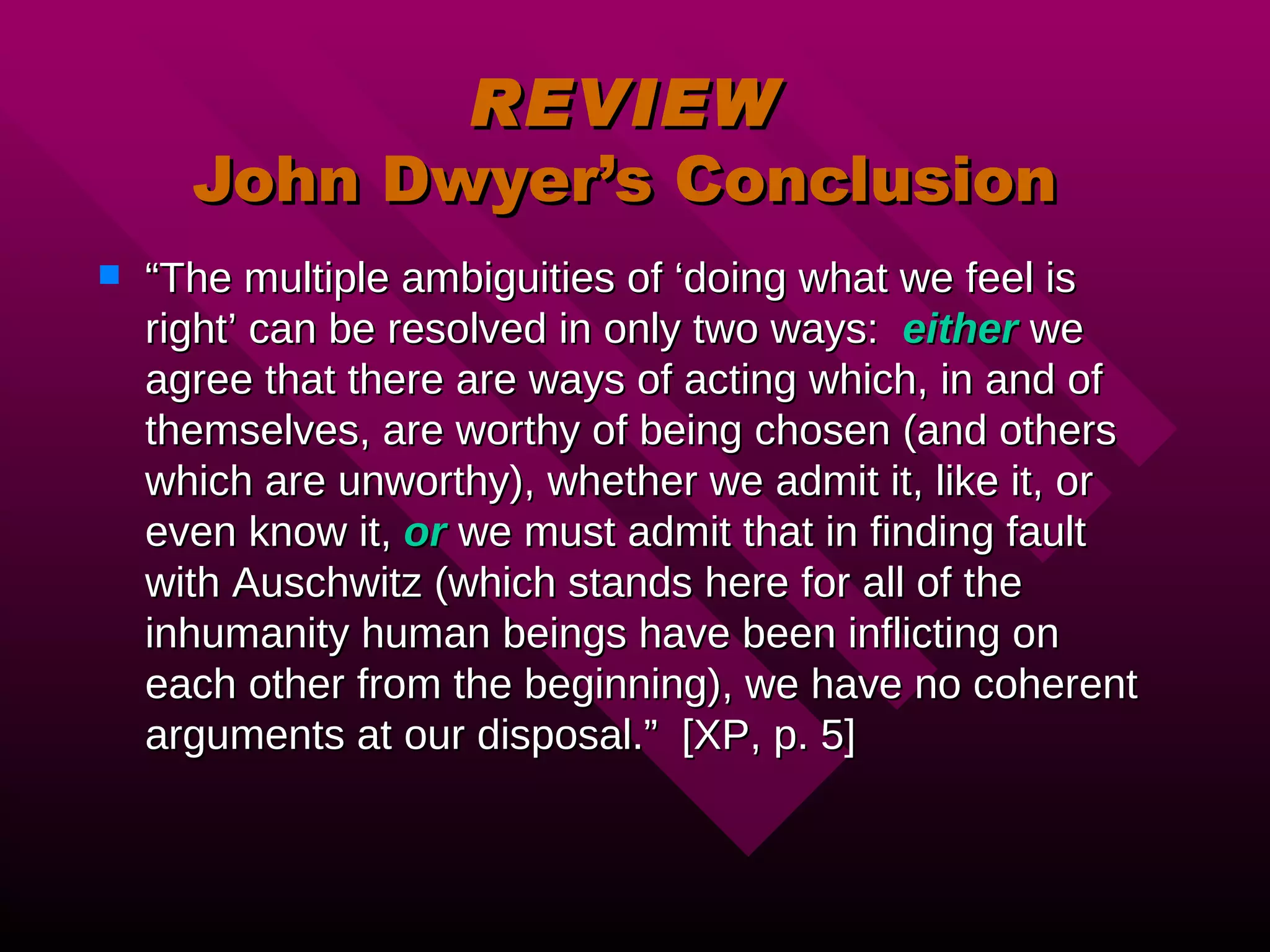 Dwyer argues that there are only two ways to resolve the ambiguities of determining right and wrong based on feelings: 1) we must agree that some actions are inherently worthy or unworthy regardless of our opinions, or 2) we have no coherent arguments against atrocities like the Holocaust. The document also discusses how morality cannot be relative, as that would mean we could not consistently call any actions wrong or make ethical judgments as a group.