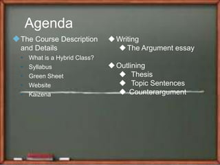This document provides an overview of an EWRT 1A hybrid class. It discusses the course description, syllabus, required materials, class policies, and assignments. The class meets in-person once a week and has online components that must be completed before the next class. Students are expected to participate regularly both in class and online. Assignments include essays, reading quizzes, and daily homework posts to the class website. Plagiarism is strictly prohibited. The document reviews how to sign up for and use the class website and online submission platform Kaizena.