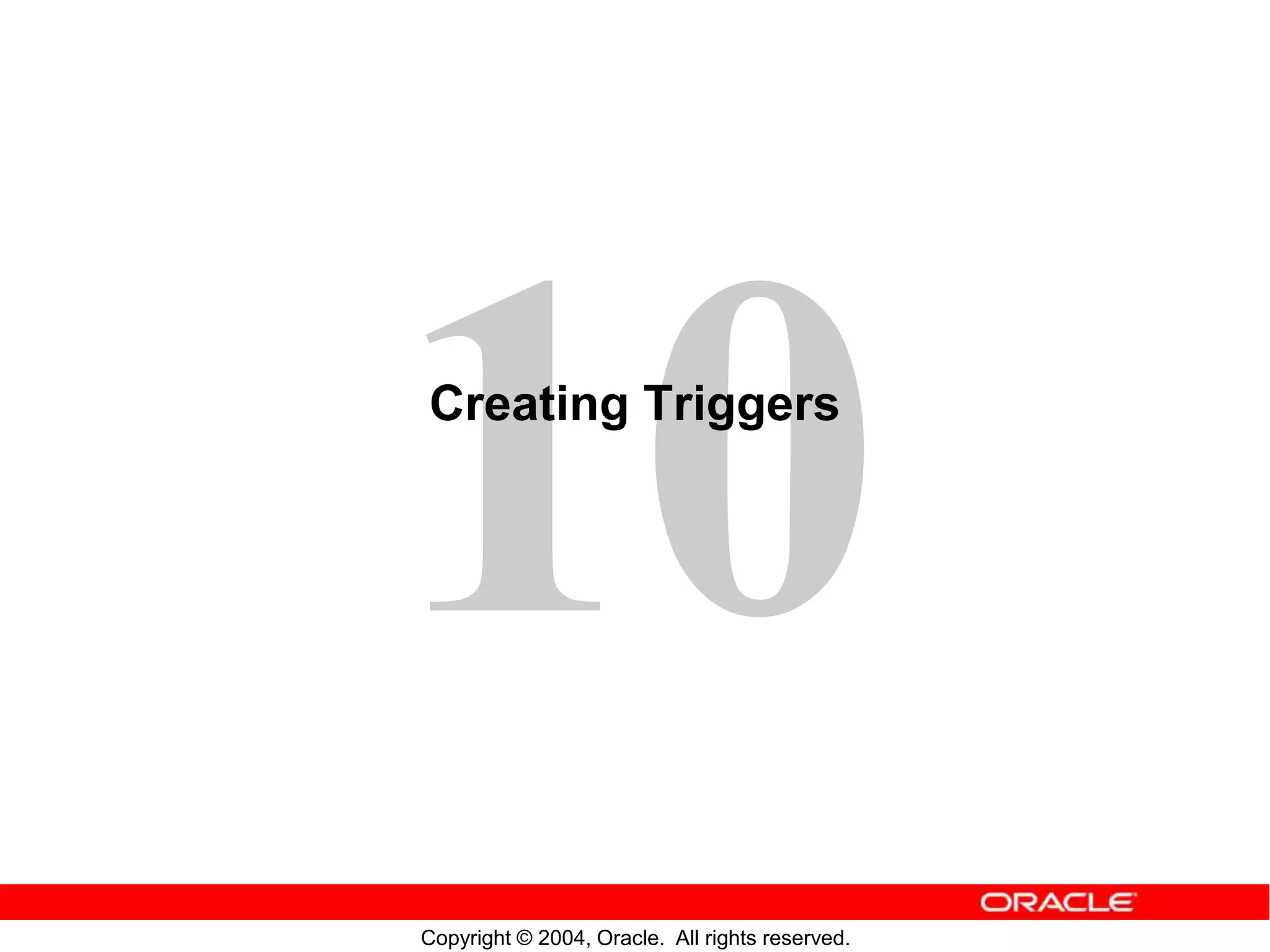 Triggers are stored PL/SQL blocks that are associated with a table, view, schema or database and execute automatically when a triggering event occurs. There are two types of triggers: application triggers that fire on application events and database triggers that fire on data or system events. Triggers can be used to centralize global operations, perform related actions, enforce complex integrity constraints and compute derived values automatically. The timing of a trigger determines whether it executes before or after the triggering event.